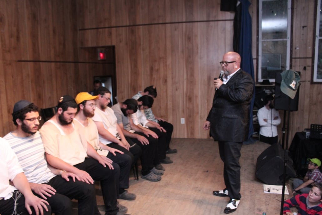 Sunday turned out to be a day with nonstop entertainment! As staff prepared for the grand outdoor play, campers enjoyed a great day of activities and water sports.  After learning classes all sections of camp filed into the shul filling al the bleachers for an amazing Hypnosis show by “Buzz” the entertainer. With silence in the room they watched as the volunteers were slowly relaxed and entertained the crowd with their unknown talents. Following the show, a delicious dinner of burgers and potatoes was enjoyed, and then everyone headed out side for the outdoor play.